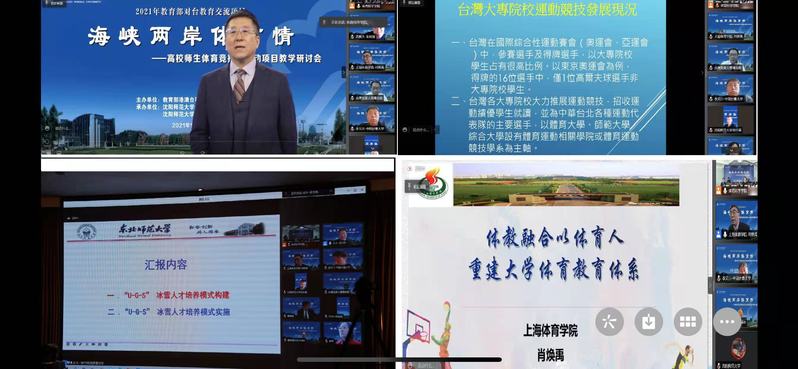 学术研讨会由我校今年会jinnianhui官网副院长田英教授主持。在历时一天的研讨会中,我校刘铸副校长、今年会jinnianhui官网副院长石云龙教授、台湾辅仁大学体育系主任蔡明志教授、东北师范大学体育学院院长张守伟教授、上海体育学院肖焕禹教授、首都体育学院茹秀英教授、徐州工程学院体育学院院长李平教授、上海对外经贸大学体育部主任崔树林教授、台湾长荣大学橄榄球队总教练陈良乾教授、台湾屏东科技大学人文社会科学院副院长郭癸宾教授、中国计量大学军体部副主任李文川教授、福建师范大学体育学院郑家铨博士等专家学者,通过线上、线下的方式呈现了12个大会主题发言。刘铸副校长以“充分发挥高校在体育文化建设和发展过程中的引领和推动作用”为题进行了发言,他表示:“体育事业的进步必须要有强有力的体育文化作为基本核心支撑,而高校又为体育文化的交流、传播与创新提供了重要的开放式平台,充分发挥高校在体育文化建设和发展过程中的引领和推动作用,意义重大,任重道远。”张守伟教授以“东北师范大学“U-G-S”冰雪人才培养模式构建与实施”为题进行了发言,他指出:“东北师范大学的‘U-G-S’冰雪人才培养模式构建了冰雪项目后备人才的合作体制和合作机制。通过实施特色人才培养、训练基地建设、科技支撑服务与冰雪装备研发,更好地服务于我国冬奥会科技保障的重大战略需求,具有重要的现实意义和价值。”蔡明志教授以“台湾大专院校竞技运动发展——以辅仁大学为例”为题进行发言,蔡教授的精彩报告,让我们更清晰的了解台湾大专院校竞技体育的发展脉络。学者们聚焦两岸高校体育竞技及专业教学,对两岸高校体育教学中师资及人才培养方面存在的共性问题互相借鉴,共同促进各种学科领域的创新和发展,提出了前瞻性与指导性的建议。